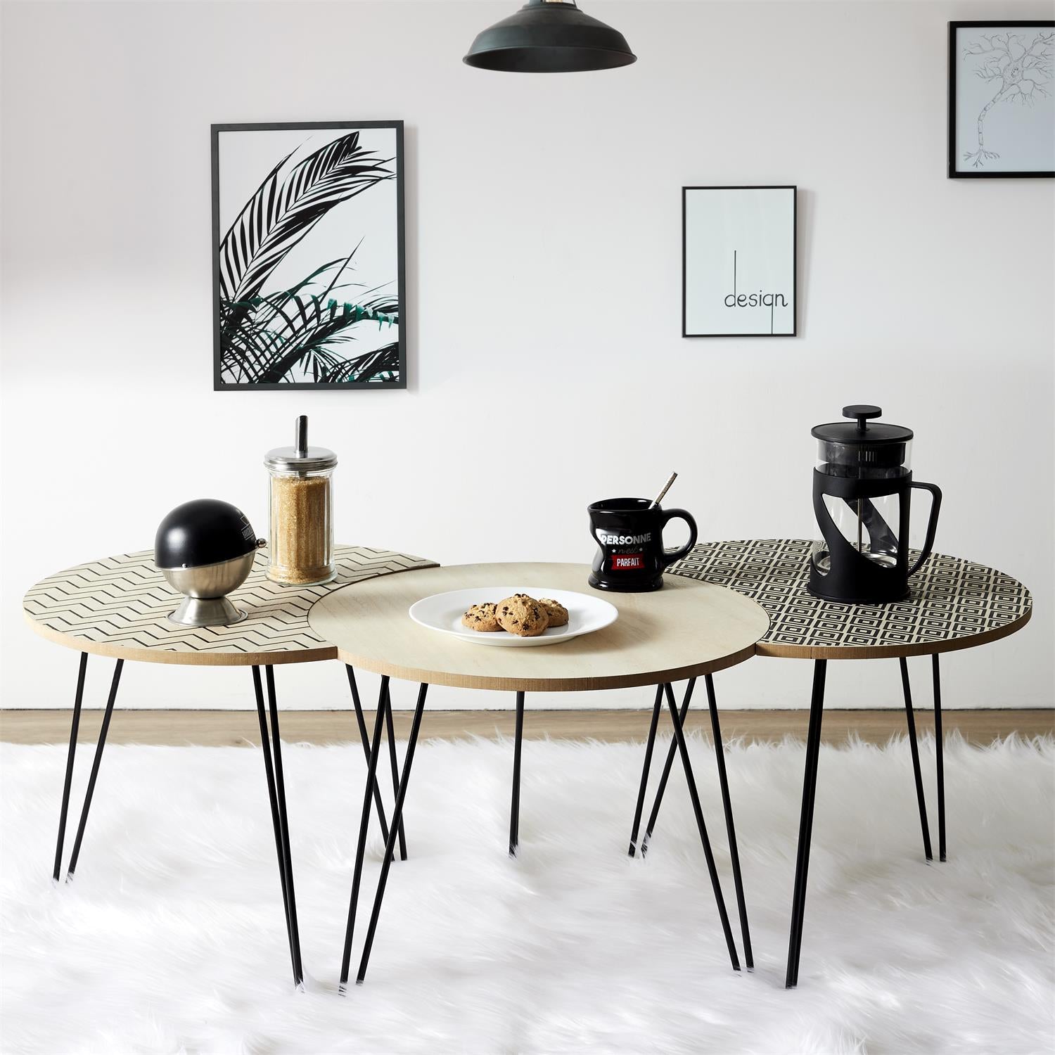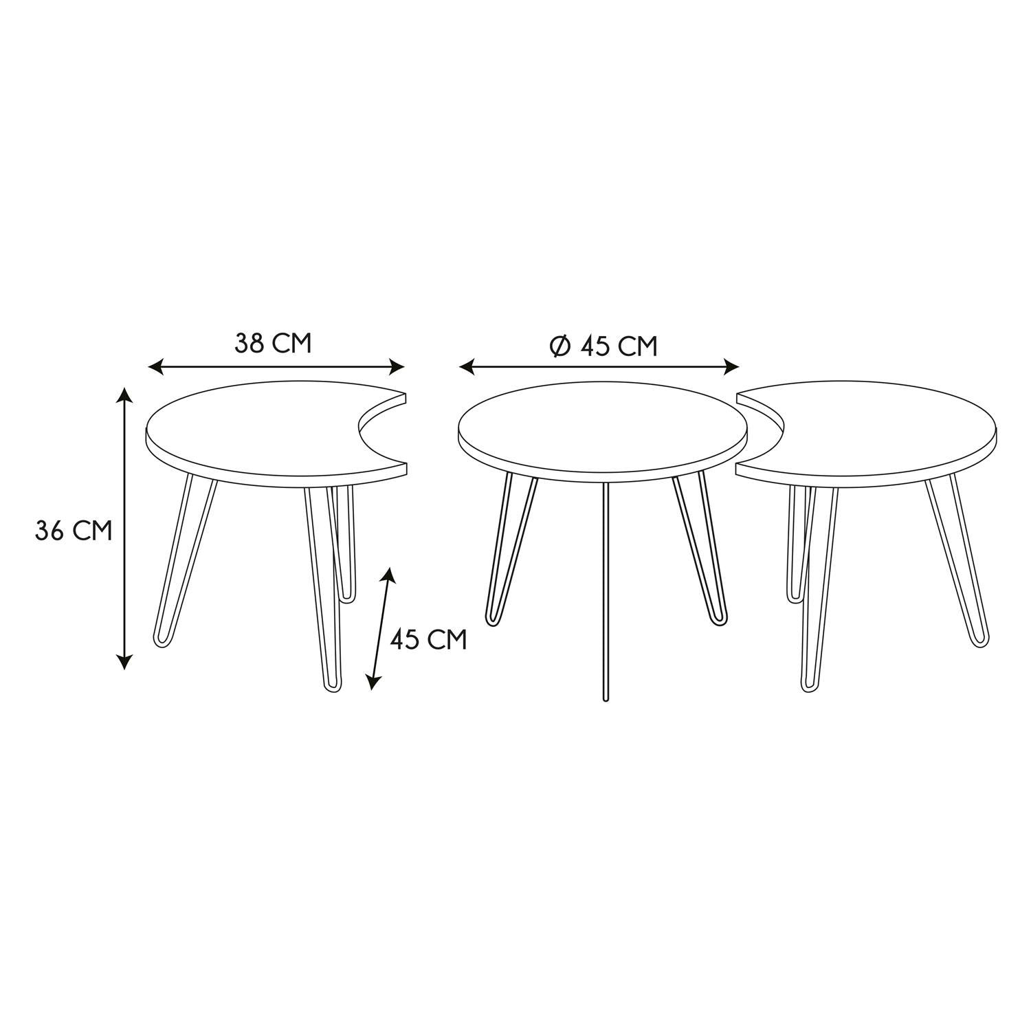 Vous ne trouvez pas la table basse idéale ? Découvrez ce modèle 3en1 qui offre plusieurs choix ! Modulez-le en fonction de vos besoins et composez un seul module, ou deux et puis 3 ! L'ensemble est réalisé avec un beau plateau en mdf qui tient sur des pieds métalliques, un mélange élégant et dans l'air du temps ! fiche technique- lot de 3 tables.- détails : tables modulables.- motifs géométriques noires.- matière des plateaux en mdf- structrue/pieds en métal.- couleurs : beige et noir.- a monter soi-même.- notice inscluse.- facile à monter.caracteristiques techniques- dimensions d'une table : diam. 45 cm x hauteur 36 cm.- poids d'une table : 2,10 kg.