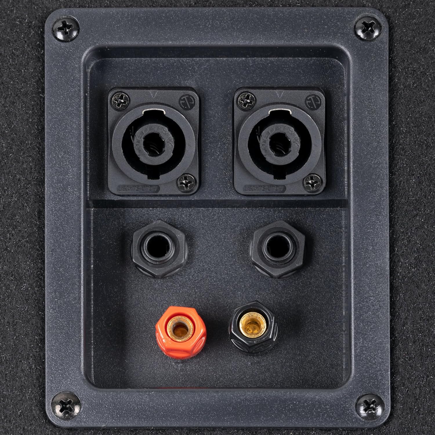 • 1 x entrée compatible Speakon, 1 x sortie compatible Speakon, 2 x entrée jack 6,3 mm, 1 x entrée stéréo à vis plaquée or