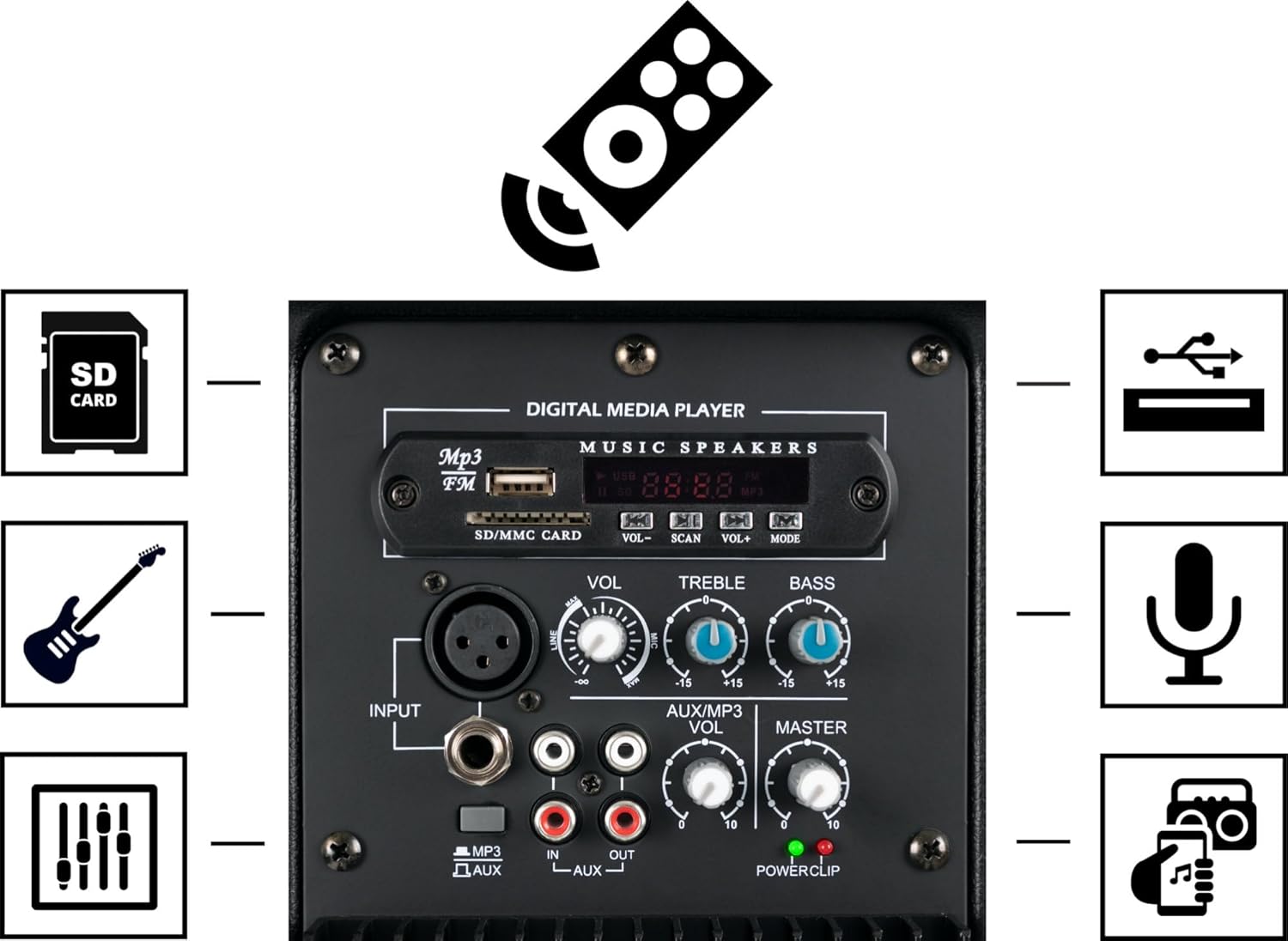 • Entrée AUX et sortie AUX (prises RCA), Contrôle du volume pour entrée Mic/Line et AUX/MP3, Lecteur multimédia pour supports USB et SD pour lecture de fichiers MP3