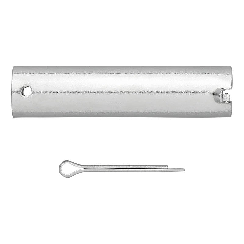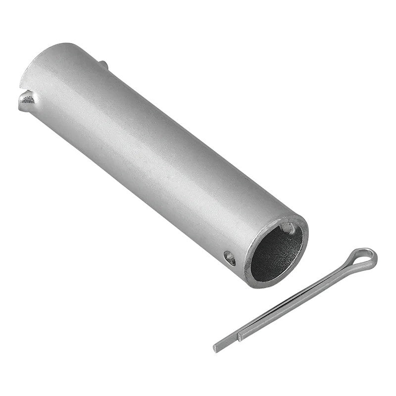 La conception de cet axe présente une surface métallique avec une finition argentée et un aspect texturé, offrant non seulement une esthétique soignée mais également une résistance accrue à l'usure. L'extrémité de l'axe présente un trou chanfreiné en forme de V, toujours attaché au tube, ce qui suggère une conception ingénieuse pour des applications spécifiques.
