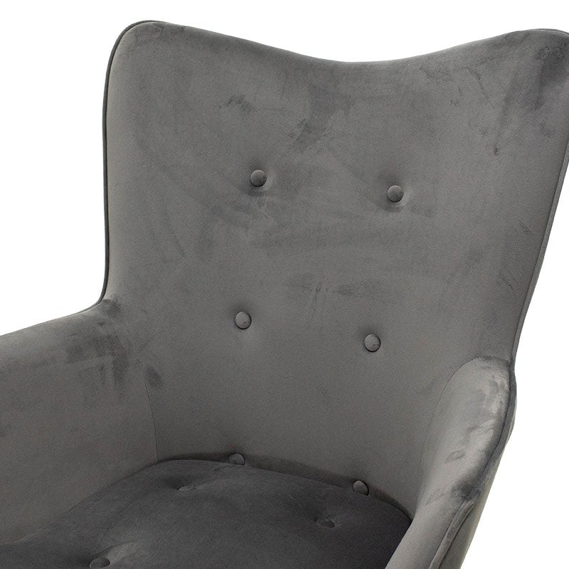 Ce fauteuil est conçu pour offrir un confort exceptionnel grâce à son assise moelleuse recouverte dun revêtement gris argenté réalisée dans dun matériau velours de haute qualité et dun dossier haut capitonné conçu dans léspirit dun mobilier classique français avec des lignes pures et des courbes subtiles qui évoquent une élégance intemporelle Les pieds en bois massif ajoute una touche chaleureuse ainsi quune beauténaturelle á cet élément décoratif Son design sobre mais efficace permet á ce meuble dassimiler parfaitement dans tout intérieur rétro ou contemporain