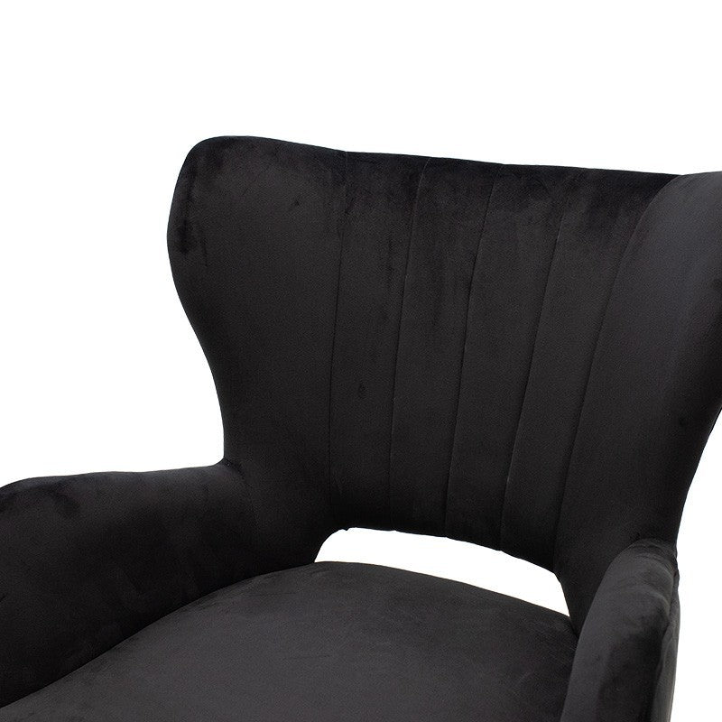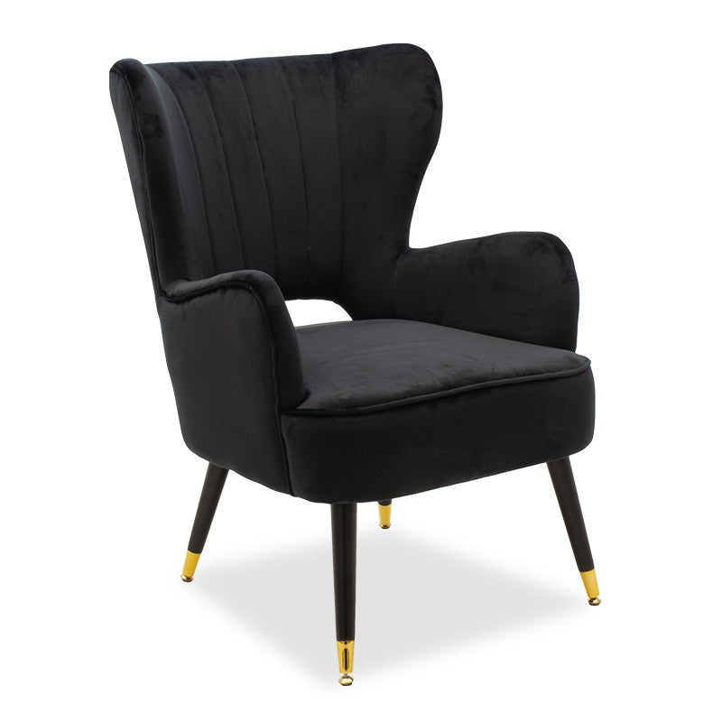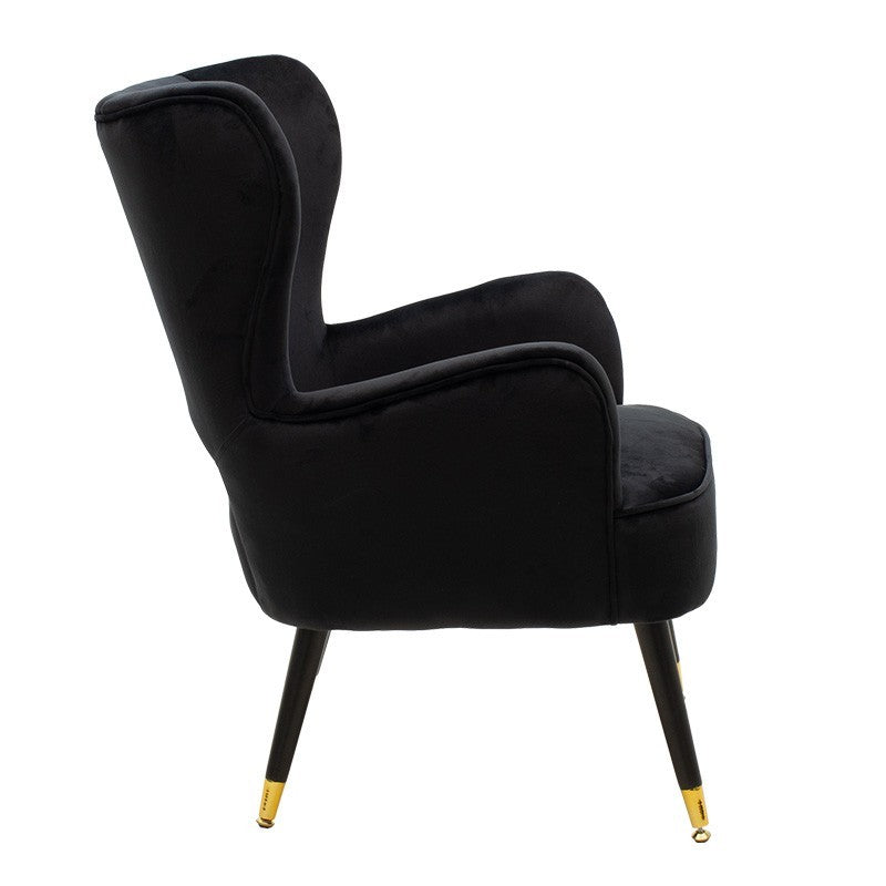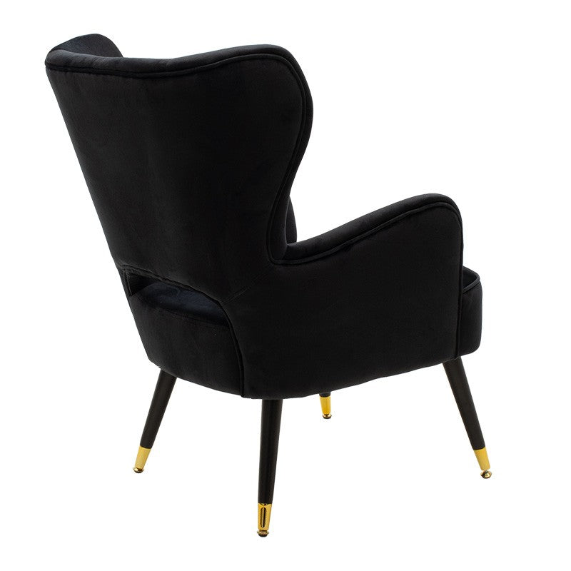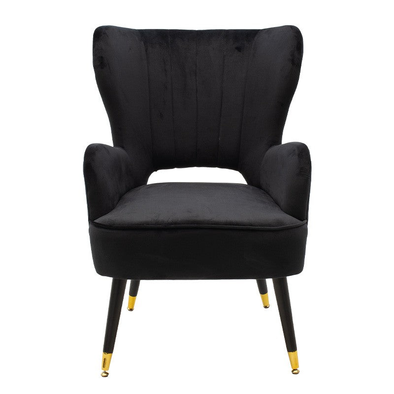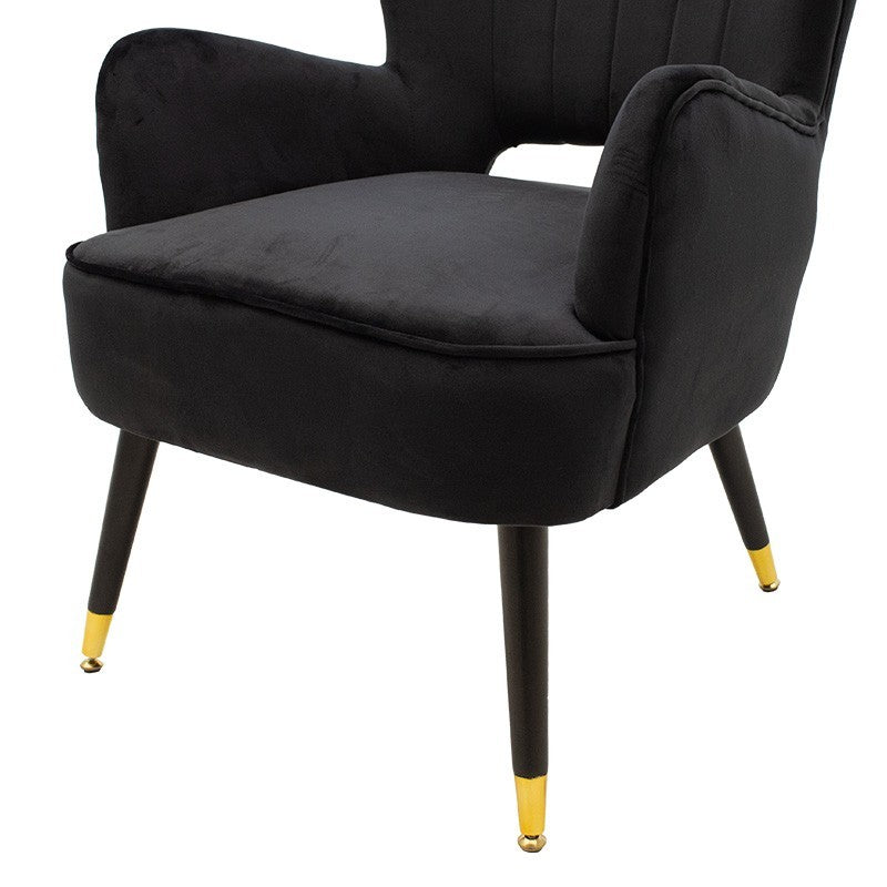 Le Fauteuil Lark velours noir présente les caractéristiques suivantes : - Structure en métal robuste et durable - Doublure en mousse et velours pour un confort extrême et un style luxueux * Pieds noirs en bois avec embouts en métal doré pour une touche d'élégance * Couvercles de protection en plastique pour protéger le sol des dommages * Disponible en couleur noir-doré pour s'intégrer parfaitement dans votre décor intérieur préféréMatière :